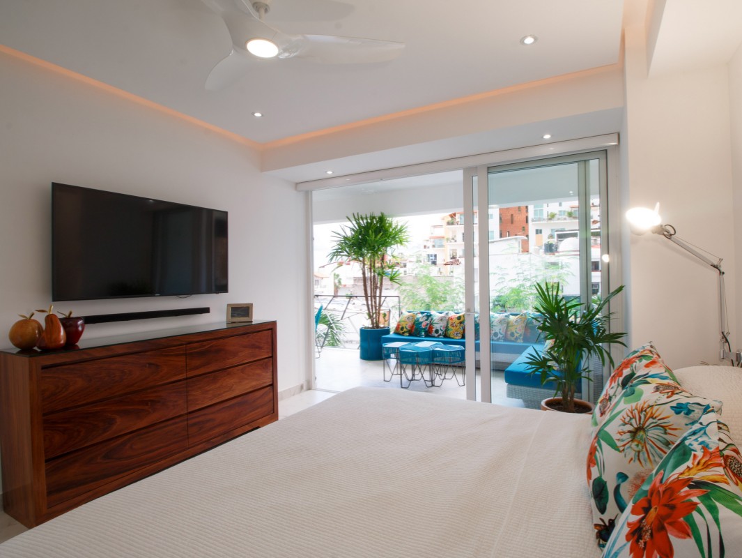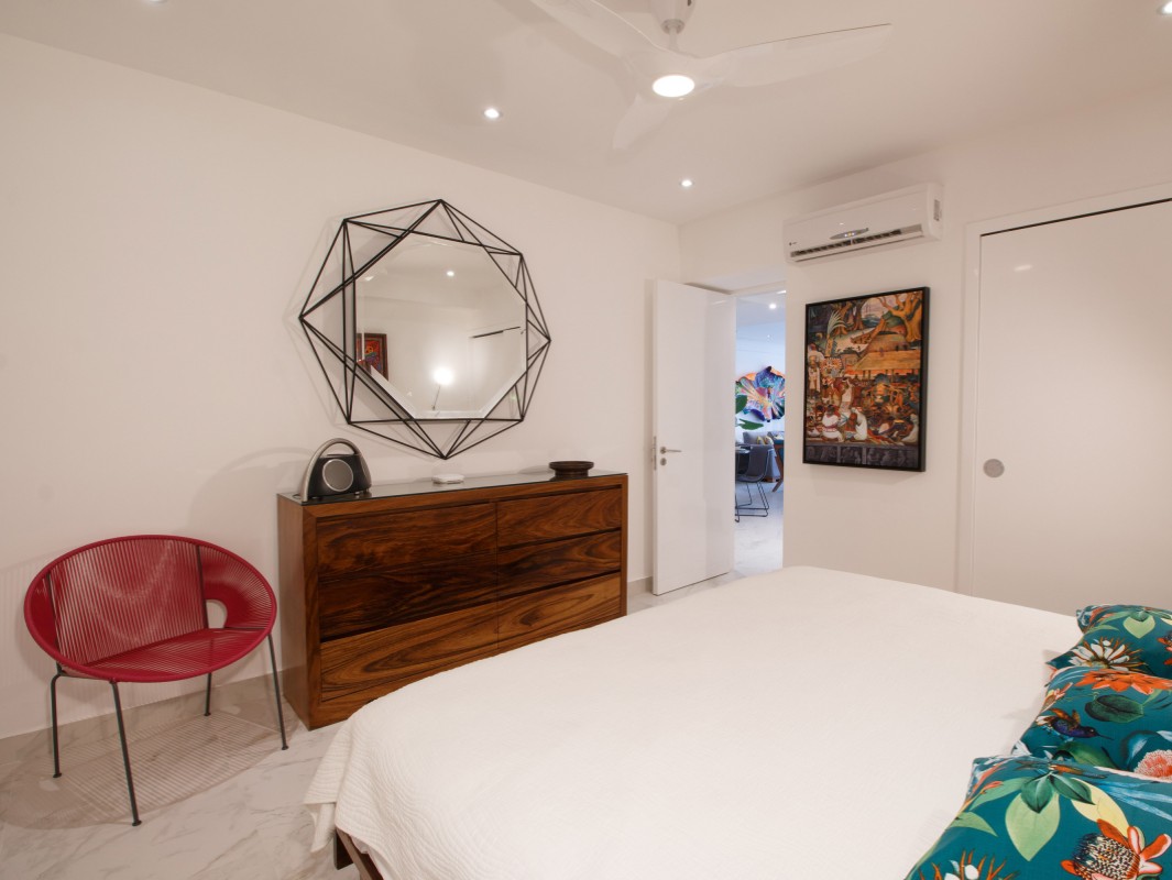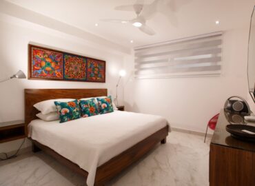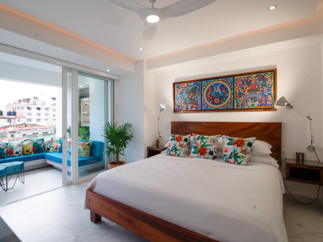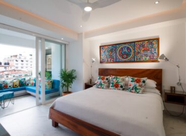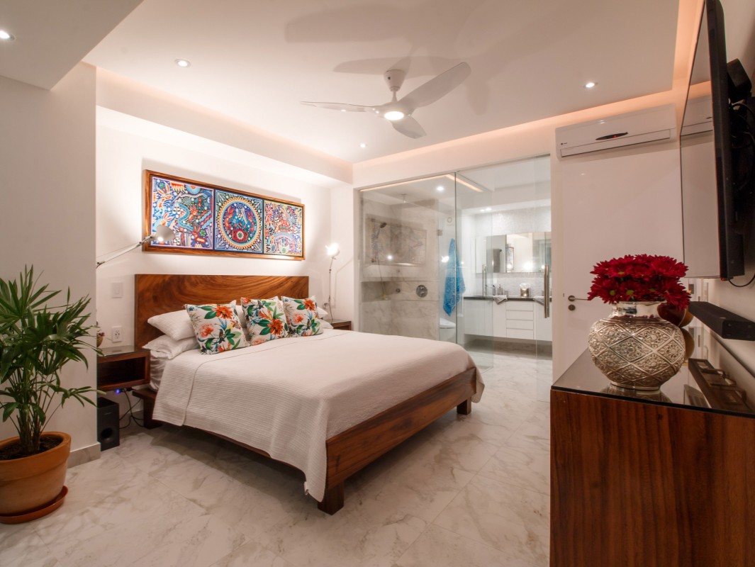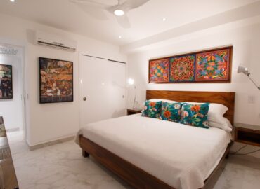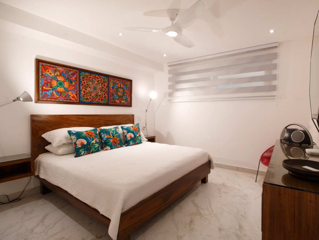 Unit 201 has 2 bedroom, 2 bathroom and is beautifully decorated. The residence offers beautiful views of the town and mountain while offering a cool sanctuary from the rooftop sun and beautiful beaches nearby. The residence features a spacious 1,500 square feet of professionally designed and thoughtfully appointed interior living space, with stunning contemporary furnishings and custom built-ins that merge modern design with contemporary Mexican art work.