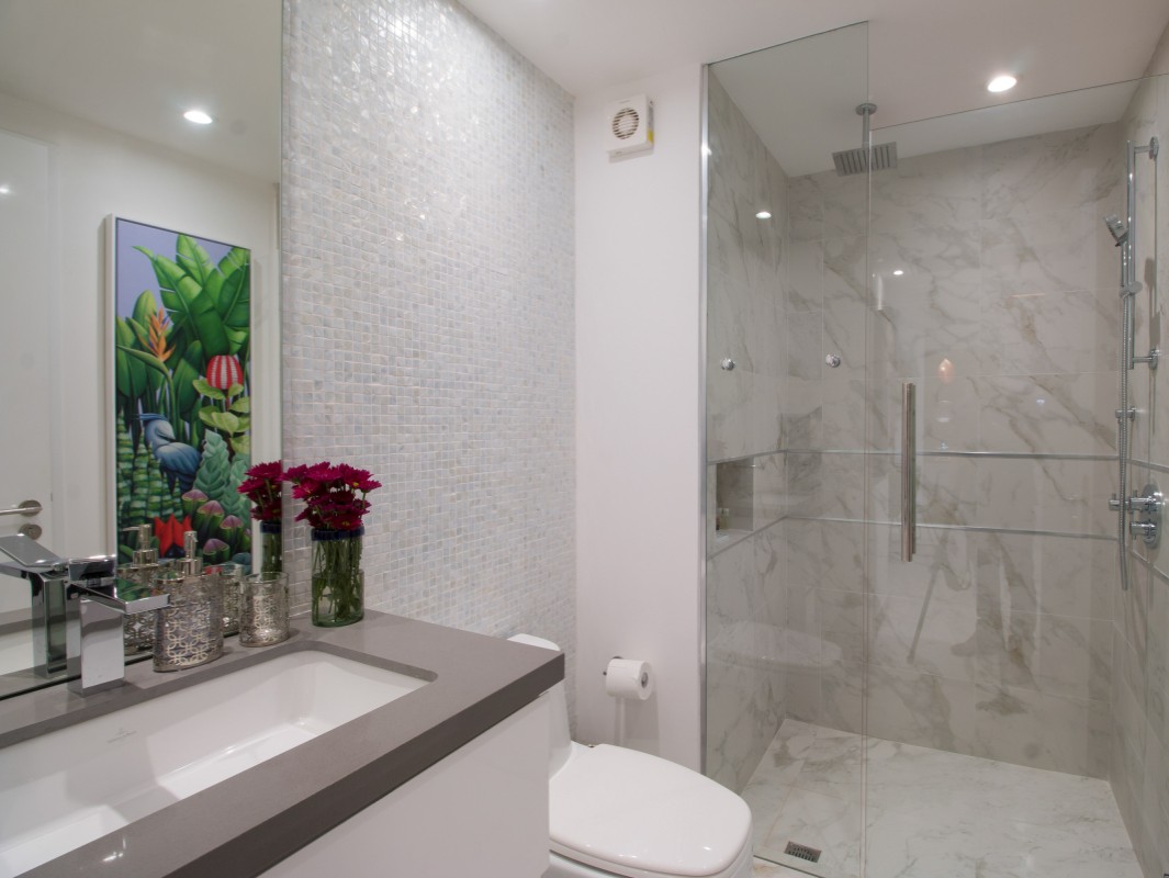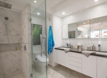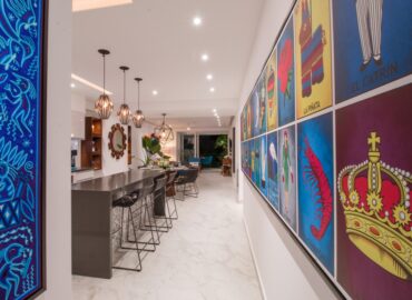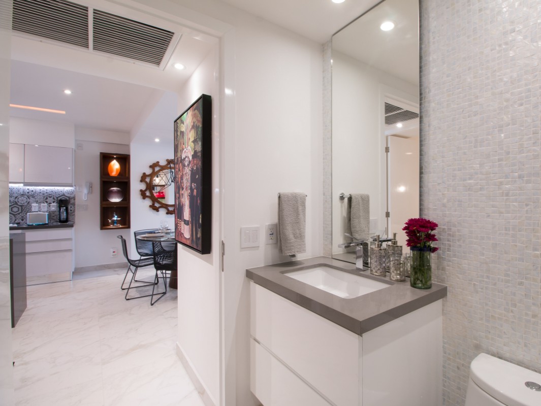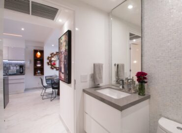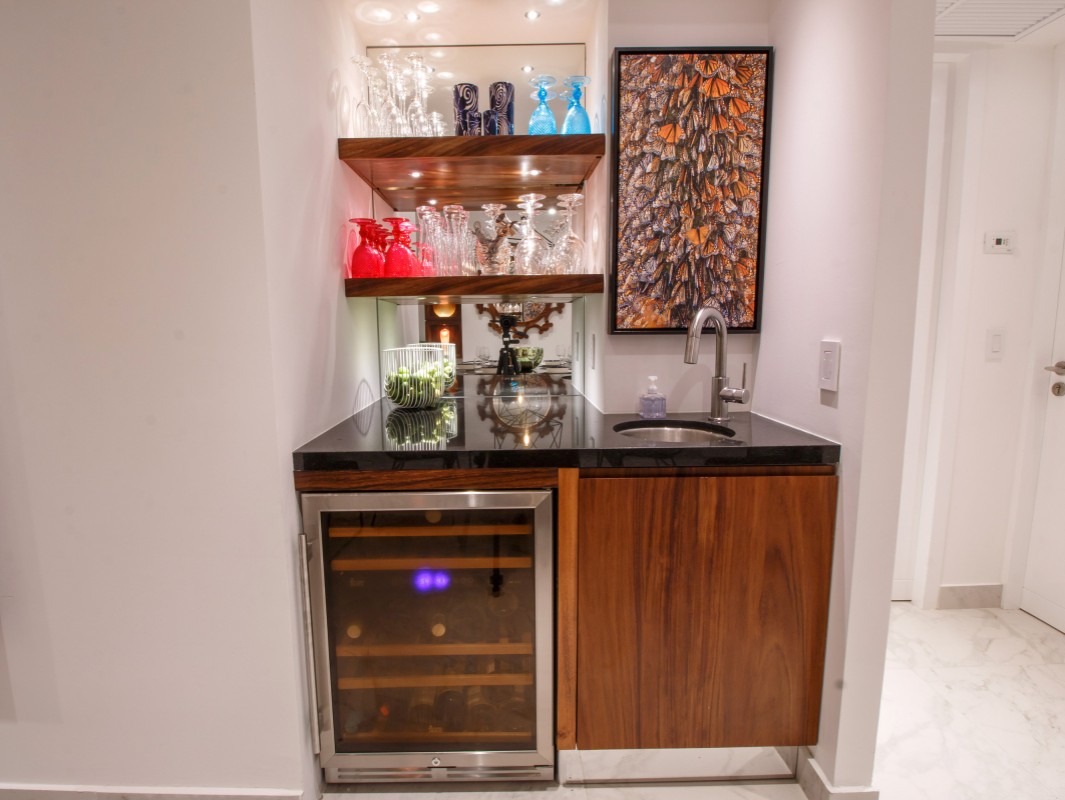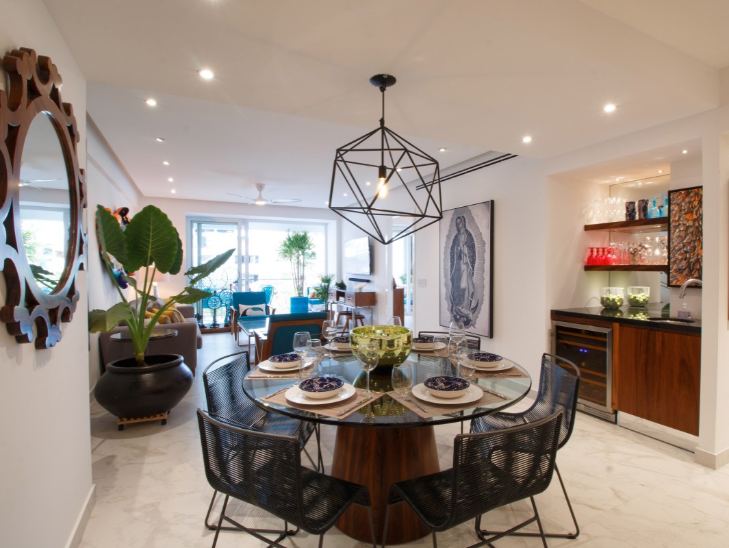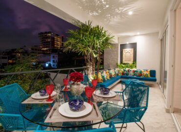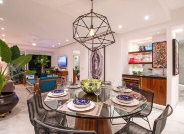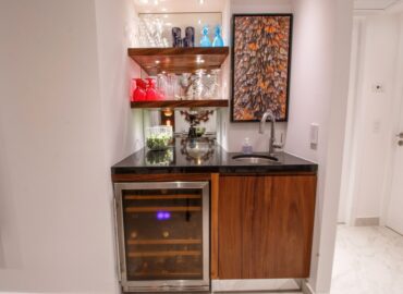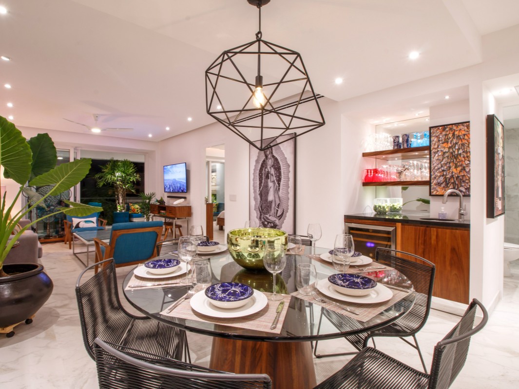 The open concept kitchen offers a large island and seating for 3 with quartz countertops, imported tile backsplash. The residence comes fully equipped with stainless steel appliances, including a refrigerator with filtered water and ice dispenser, 5 burner gas cooktop with oven, microwave, dishwasher, toaster, soda stream, blender and coffee maker. There is also a separate wet bar for entertaining. The dining room affords comfortable dining for six, or dine on the large terrace and enjoy the views while contemplating world-renowned Puerto Vallarta.
